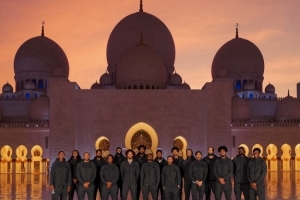 体育资讯10月1日讯 76人官方晒全队在阿布扎比地标谢赫扎伊德清真寺合照的合照。