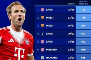 本赛季开局,凯恩仅用742分钟时间就为拜仁造了20个进球(进球+助攻),比2011年的梅西快了7分钟,刷新历史。