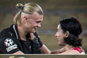 哈兰德与南野拓实拥抱寒暄,此役哈兰德为曼城打进2球,而效力于摩纳哥的南野拓实担任替补未能出场。