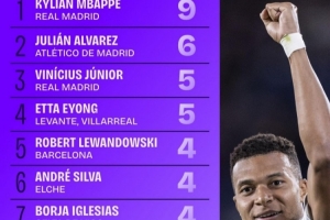 体育资讯10月7日讯 日前,Squawka统计了本赛季西甲射手榜,姆巴佩9球居首。