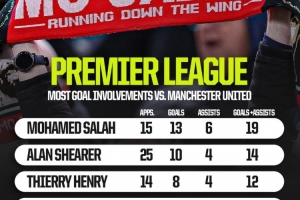 体育资讯10月17日讯 北京时间10月19日晚上,利物浦将在英超第8轮比赛中主场对阵曼联,Squawka统计了球员在对阵曼联的英超比赛中的参与进球数量,萨拉赫19球居首。