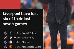 利物浦各项赛事近7场6败,联赛杯出局、止步16强,英超落后榜首7分。上赛季的耐考王如今节节退败。