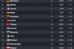 今年欧锦赛的冠亚军排名均上升,德国男篮升至第2,力压塞尔维亚男篮成为欧洲赛区第一,土耳其男篮狂升15位,来到第12。