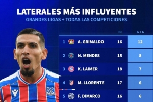 本赛季五大联赛边卫参与进球榜:格里马尔多12球居首,门德斯8球