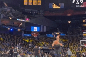 赛前热身环节,库里秀了一把空接背扣,落地后还原地转身耍帅,心情不错。